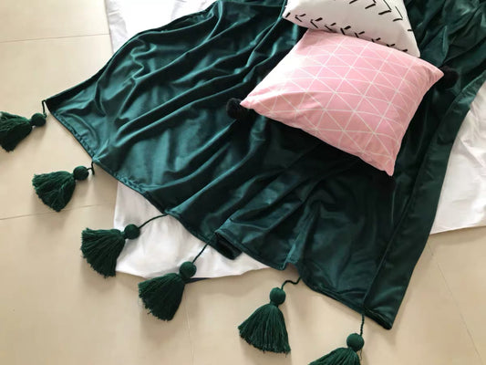 Handcrafted Vintage Green Throw Blanket with Elegant Tassels