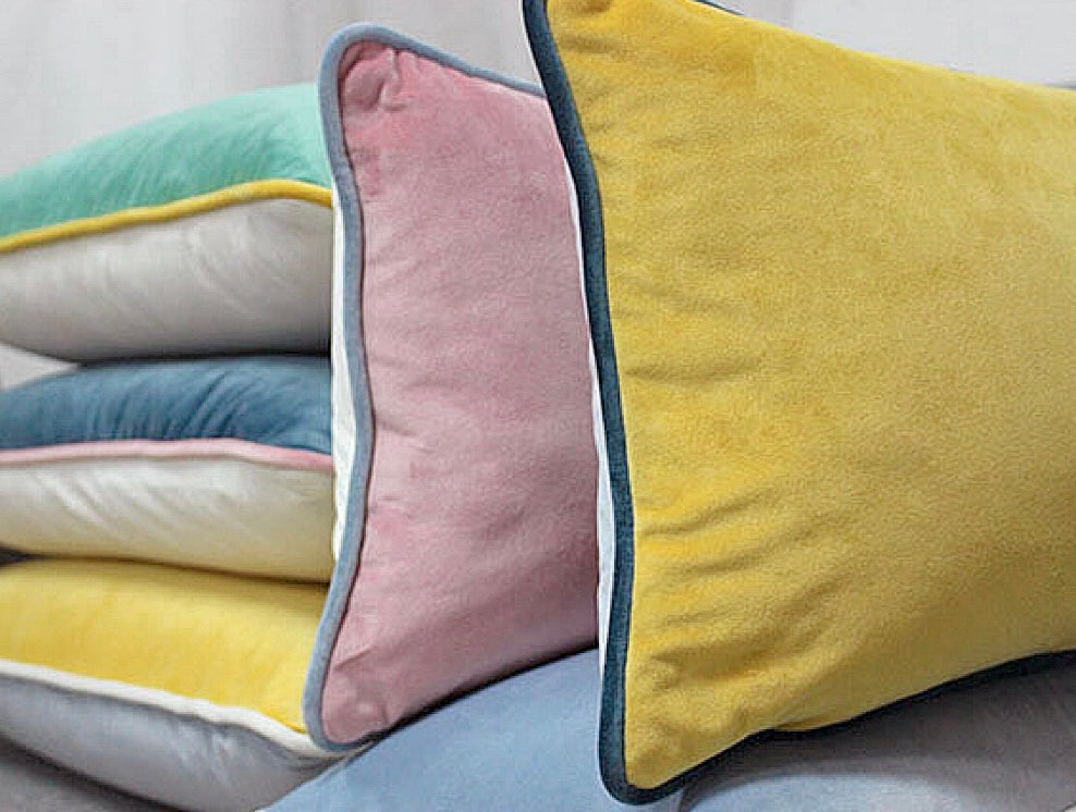 Lemon Yellow and Grey Blue Double-Sided with Blue Piping Velvet Lumbar Pillow Cover